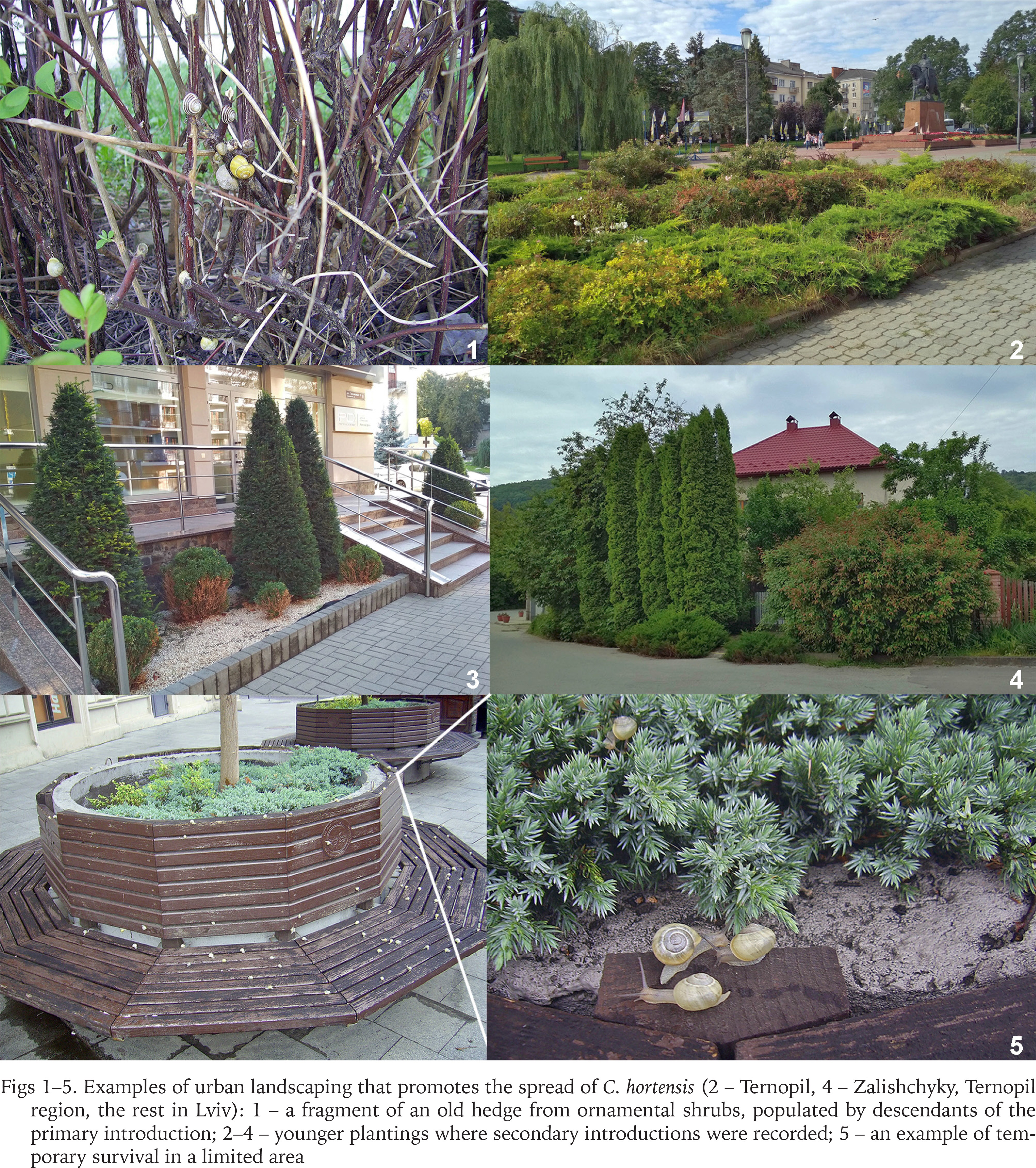 In settlements and their immediate environs, we paid particular attention to those types of landscaping that played and continue to play a decisive role in the initial colonisation of areas by C. hortensis. For the primary introduction of C. hortensis to Western Ukraine, these were old hedges made of ornamental shrubs (Fig. 1), less often also of maples, hornbeams, etc. In the second half of the 20th century, such hedges were often planted along streets, near railway stations, schools, hospitals, administrative buildings, as well as in parks and squares (Sverlova 2002a, Gural-Sverlova & Gural 2021a). Having arrived there together with the plants, the snails then populated other suitable habitats due to their own locomotor activity, or by accidental or intentional transfers by people, especially children (Sverlova 2002a).