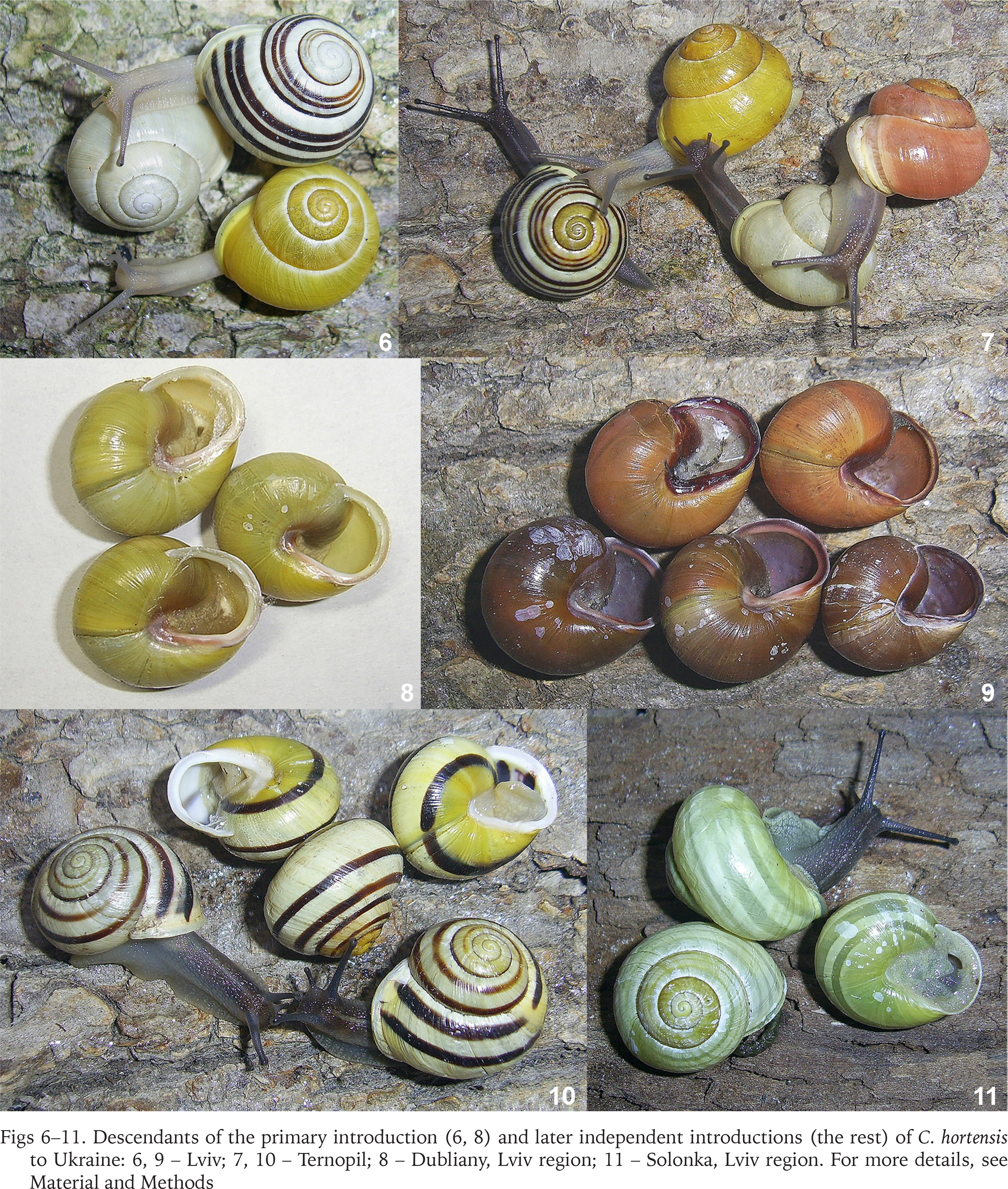The descendants of the primary introduction have no more than three variations of the shell colouration (yellow unbanded, white unbanded, white banded), and only a light body, without pronounced grayish or reddish (brownish) pigmentation (Fig. 6). Such populations can be reliably diagnosed by the complete absence of banded shells with a non-white ground colour in combination with a light body colouration in all individuals (Gural-Sverlova & Gural 2021a, 2022a). In contrast, yellow banded shells are common throughout the present range of C. hortensis (Gural-Sverlova & Gural 2022a, iNaturalist 2025). They are frequently found in both natural and other introduced populations (Egorov 2015: fig. 3, Gural-Sverlova & Gural 2021a, iNaturalist 2025), including secondary introductions of this species to Western Ukraine (Fig. 7). This is also true for the clearly expressed variability in the body colouration (Fig. 7). In addition to yellow banded, descendants of secondary introductions may have pink (Fig. 7, 9) and occasionally brown (Fig. 9) shells.