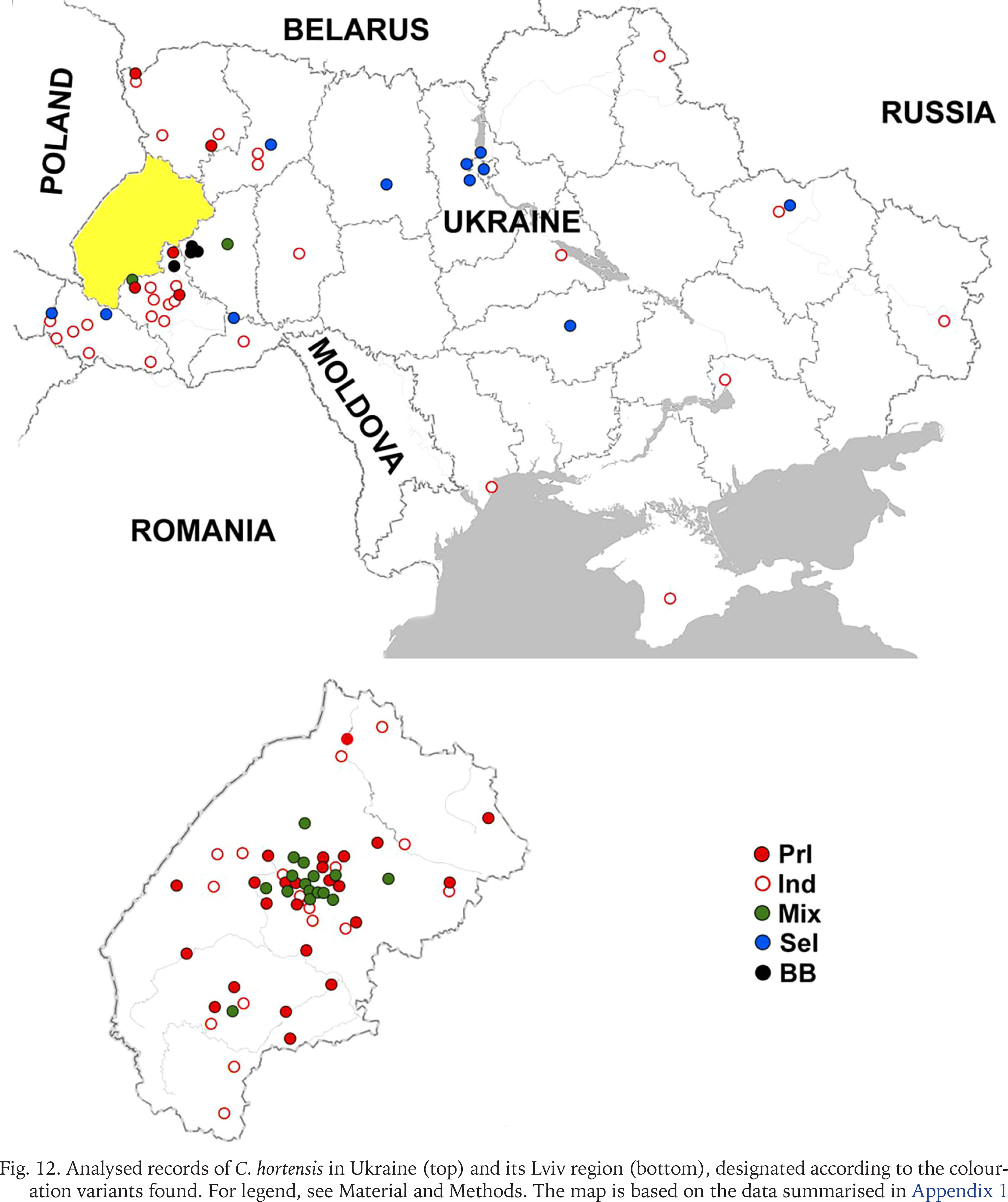 We also wanted to summarise all available and reliable data on the findings of various colouration forms of C. hortensis in Ukraine in order to create a basis for subsequent monitoring of not only the gradual dispersal of this species across Ukraine (Gural-Sverlova et al. 2024), but also the connection of this process with different “waves” of introduction.