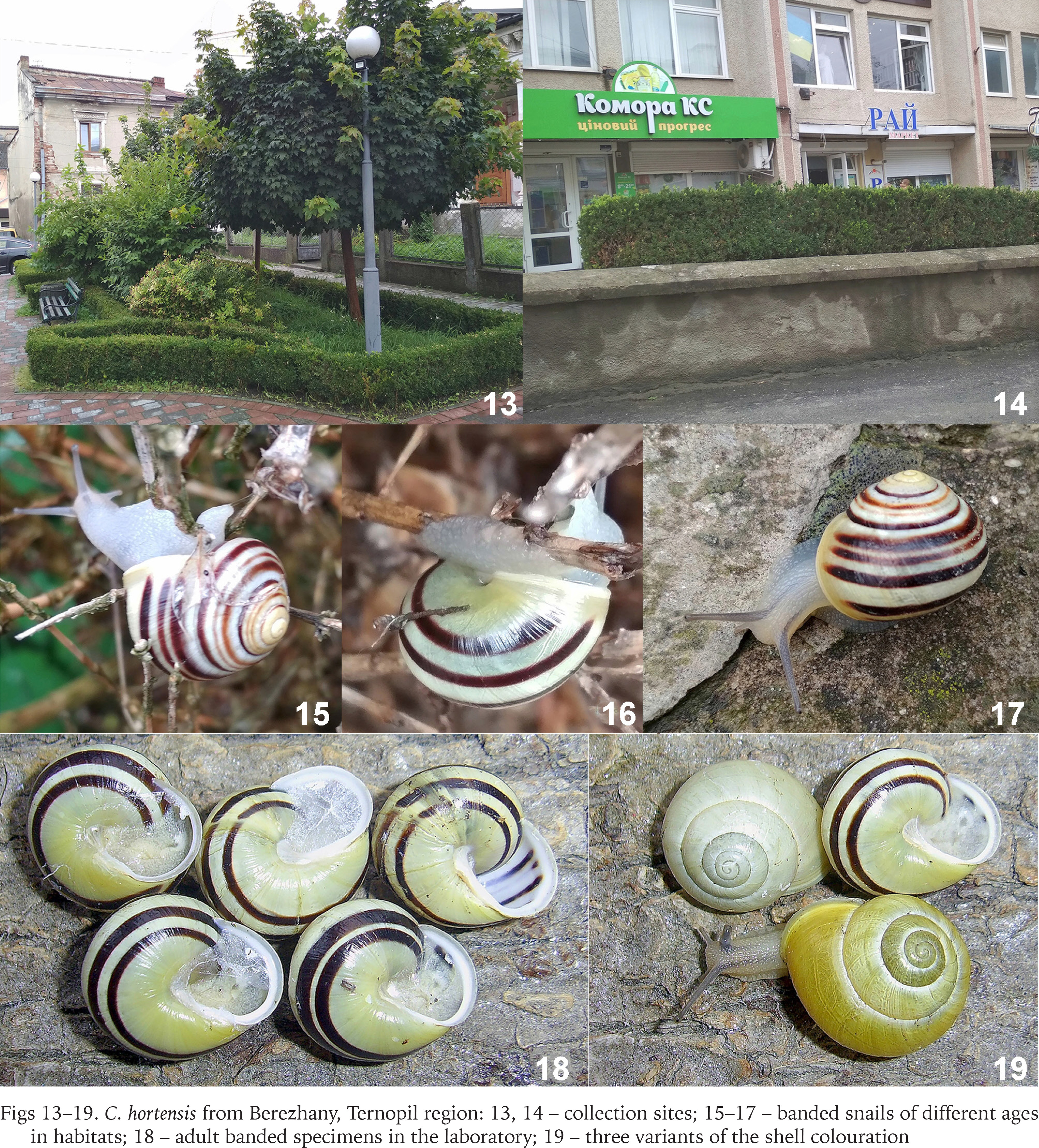 C. hortensis from Berezhany, Ternopil region: 13, 14 – collection sites; 15–17 – banded snails of different ages in habitats; 18 – adult banded specimens in the laboratory; 19 – three variants of the shell colouration