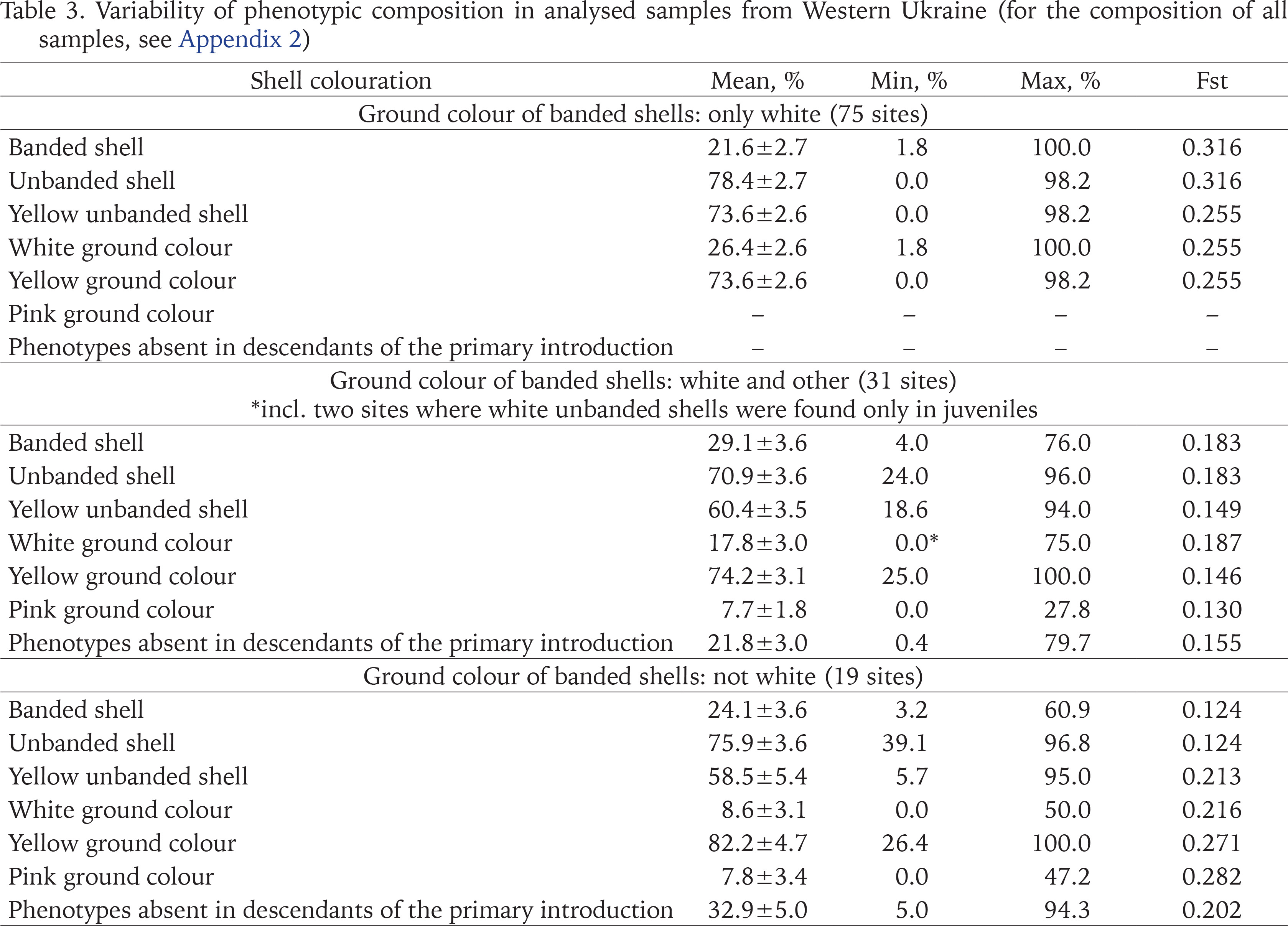 The variability of the phenotypic composition was analysed in three groups of samples differing in the ground colour of banded shells: only white, white and other, only non-white (Table 3). All samples were collected in Western Ukraine, where the listed groups most often correspond to primary introduction, a mix of introductions, and secondary introductions. The frequency of banded shells varied significantly in all groups, but its average value was always low: from 22% for the primary introduction to 29% for mixed populations. The prevailing phenotype was usually a yellow unbanded shell, which was particularly pronounced in the descedans of the primary introduction (Table 4). On average, every fifth specimen in the second group and every third specimen in the third group had a shell colouration that was absent in the descendants of the primary introduction (Table 3).