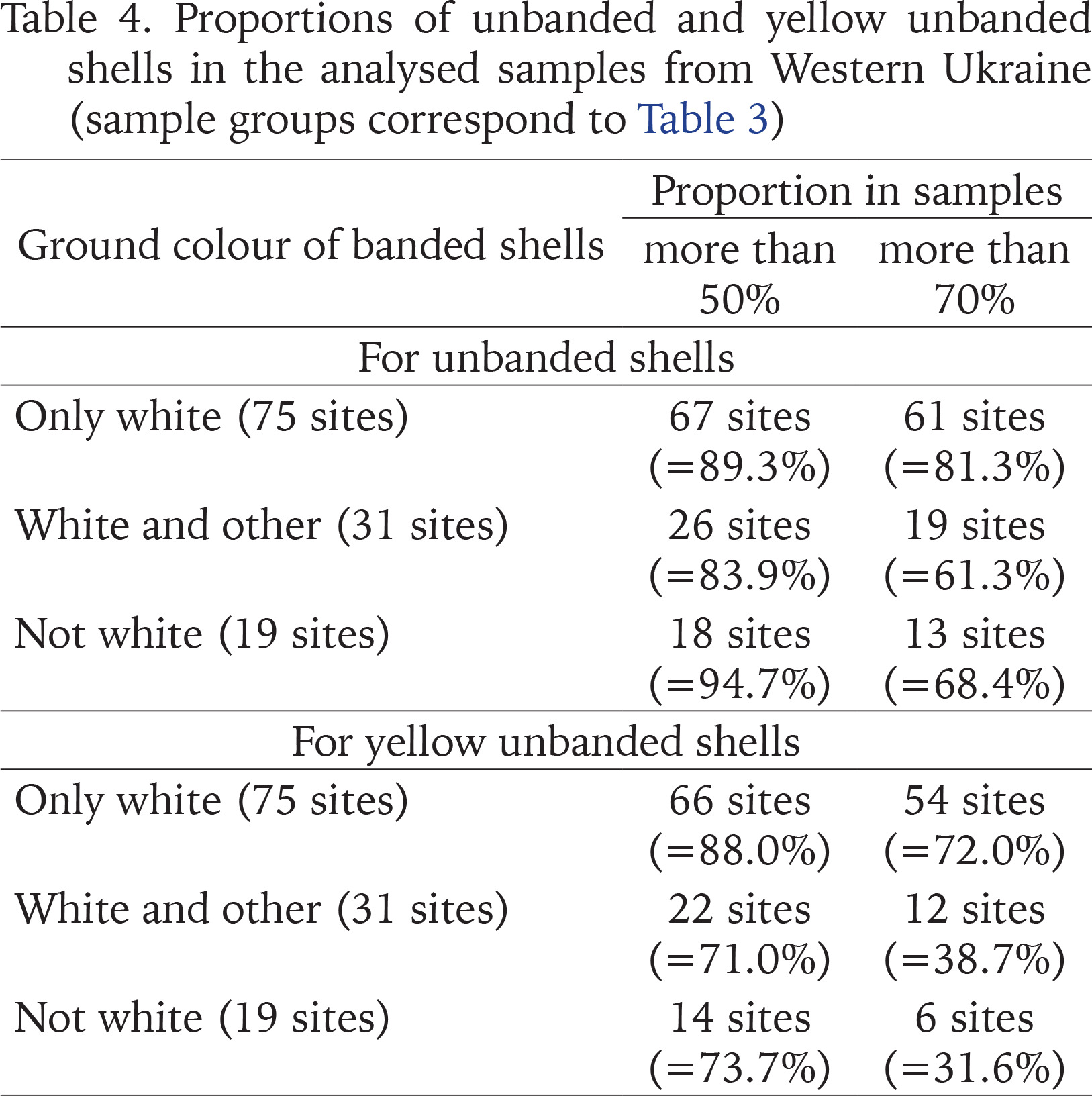 Proportions of unbanded and yellow unbanded shells in the analysed samples from Western Ukraine (sample groups correspond to Table 3)