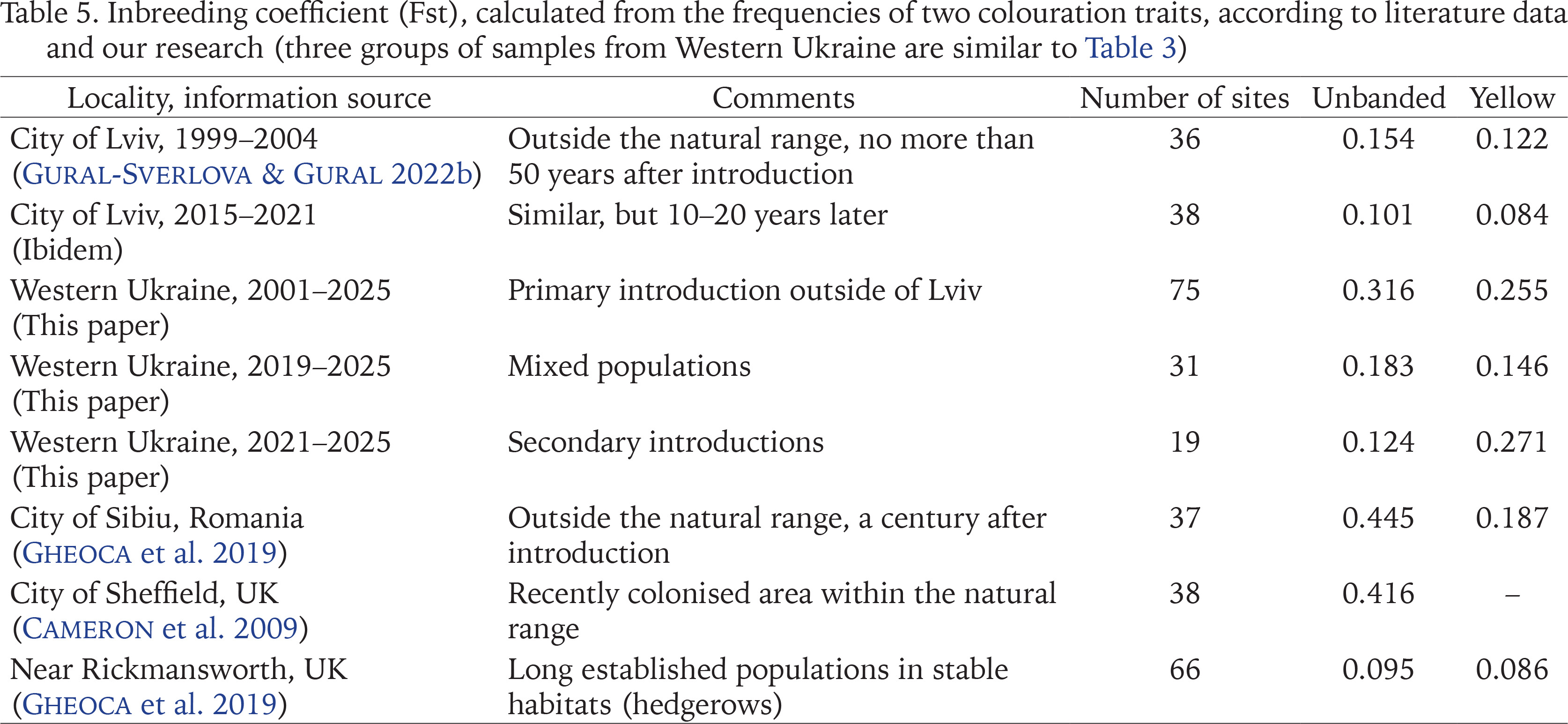 Several recent publications have analysed the possible relationship between the level of phenotypic variability in introduced and/or urban populations of Cepaea and the time when they colonised certain areas (Cameron et al. 2009, 2014, Gheoca et al. 2019, Cameron & von Proschwitz 2020). It has been suggested that a high level of variability, assessed by the inbreeding coefficient Fst, is characteristic of recently populated areas, both within the natural range and outside it (Cameron et al. 2009). However, values of Fst can be influenced also by some other factors (Cameron & von Proschwitz 2020, Gural-Sverlova & Egorov 2021). Thus, low Fst values even in recently colonised areas outside the natural range may be related either to a common origin or to “a relatively uniform and rigorous selection regime” (Cameron & von Proschwitz 2020). Both the first and second are obviously true for populations formed by descendants of the primary introduction of C. hortensis to Western Ukraine. It is no coincidence that in Lviv the calculated Fst values for unbanded/banded and yellow shells are not only low, but are quite comparable with long established populations in England (Table 5), which is part of the natural range of C. hortensis. When including in the calculations a larger number of samples collected over much larger territories (several administrative regions in Western Ukraine), these values increase by 2–3 times even for primary introduction. However, even in the second and third groups of samples (Table 3), under the influence of secondary introductions of different origins, Fst for unbanded shells is significantly lower than in Sibiu or Sheffield (Table 5).