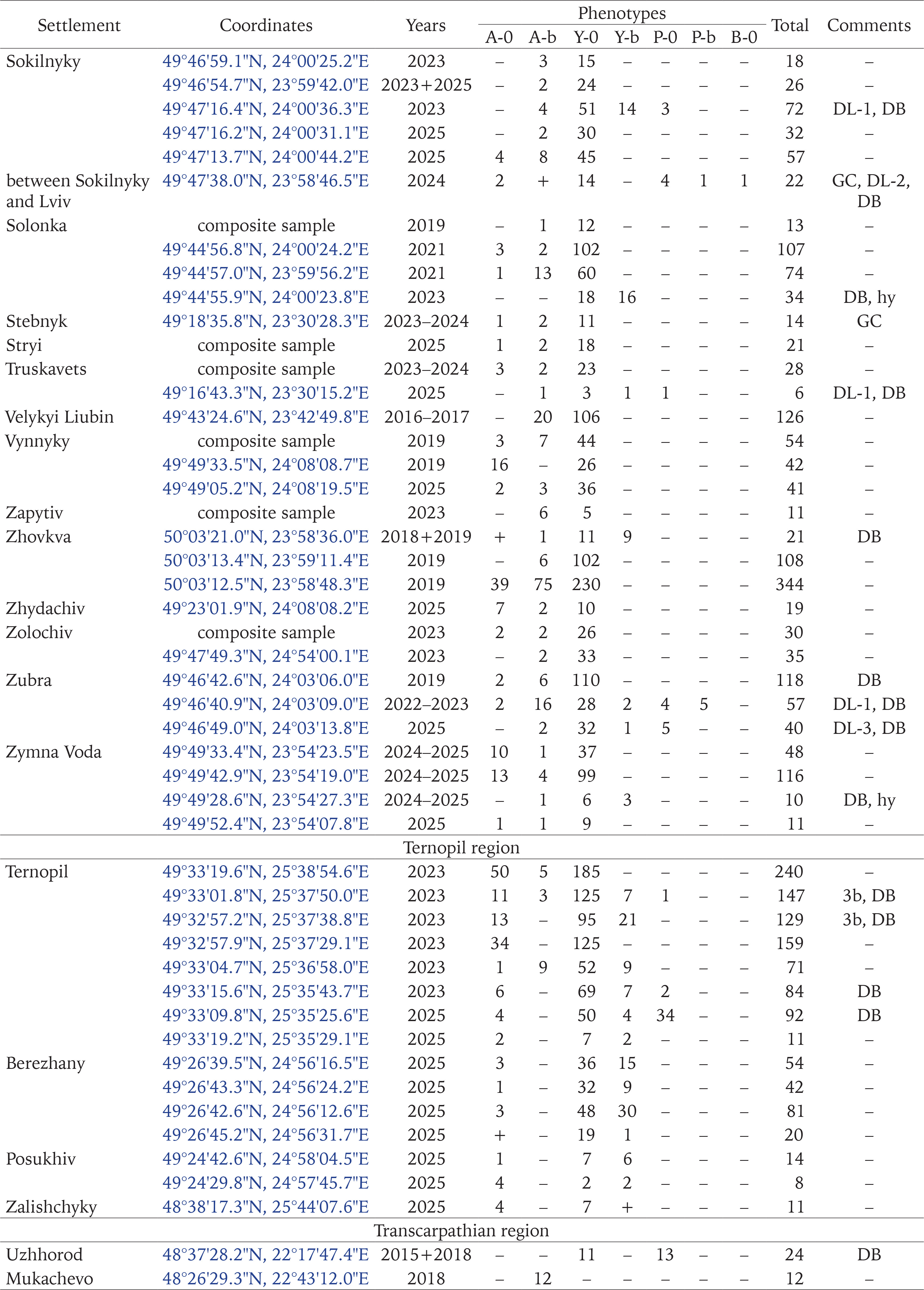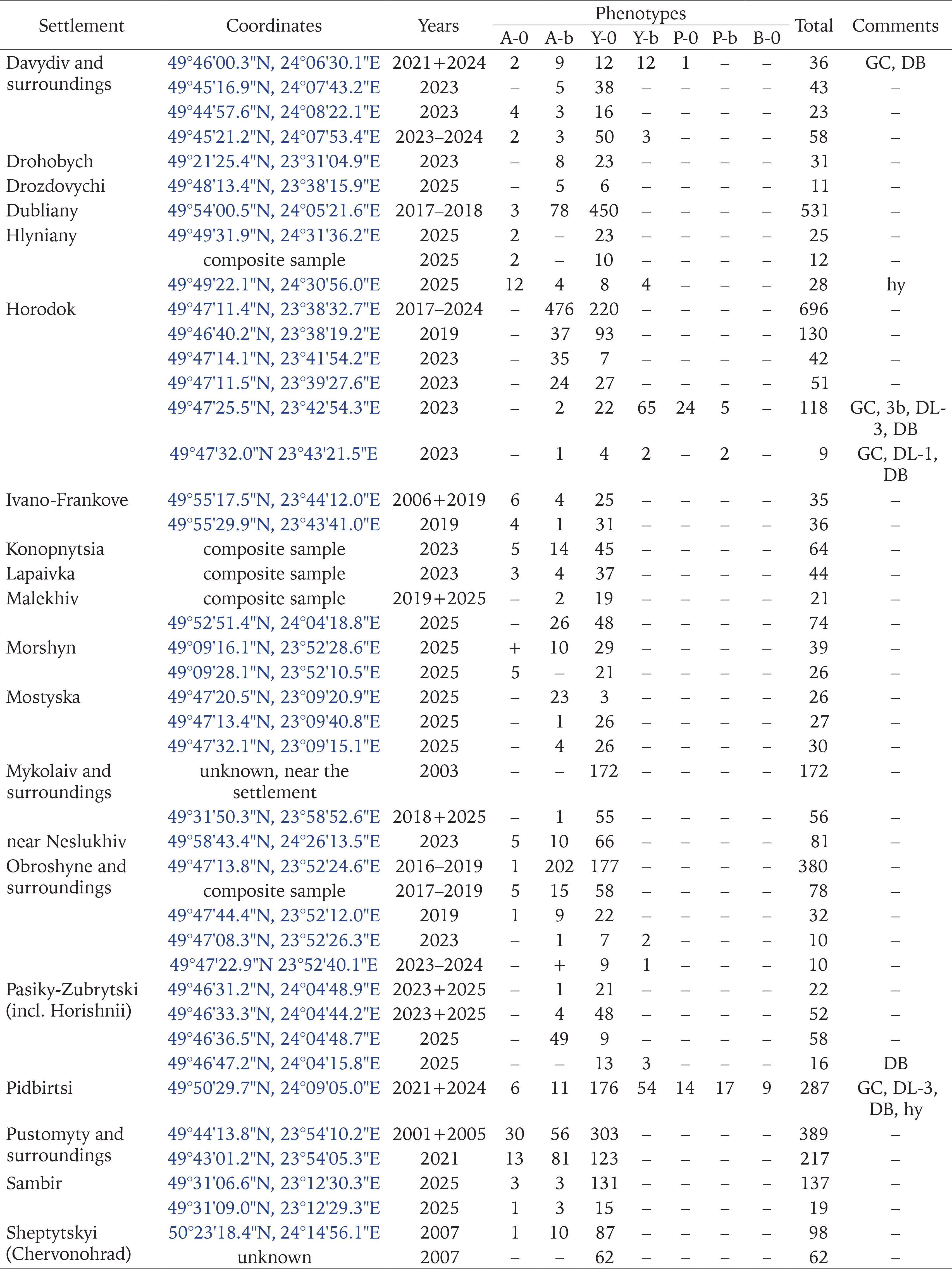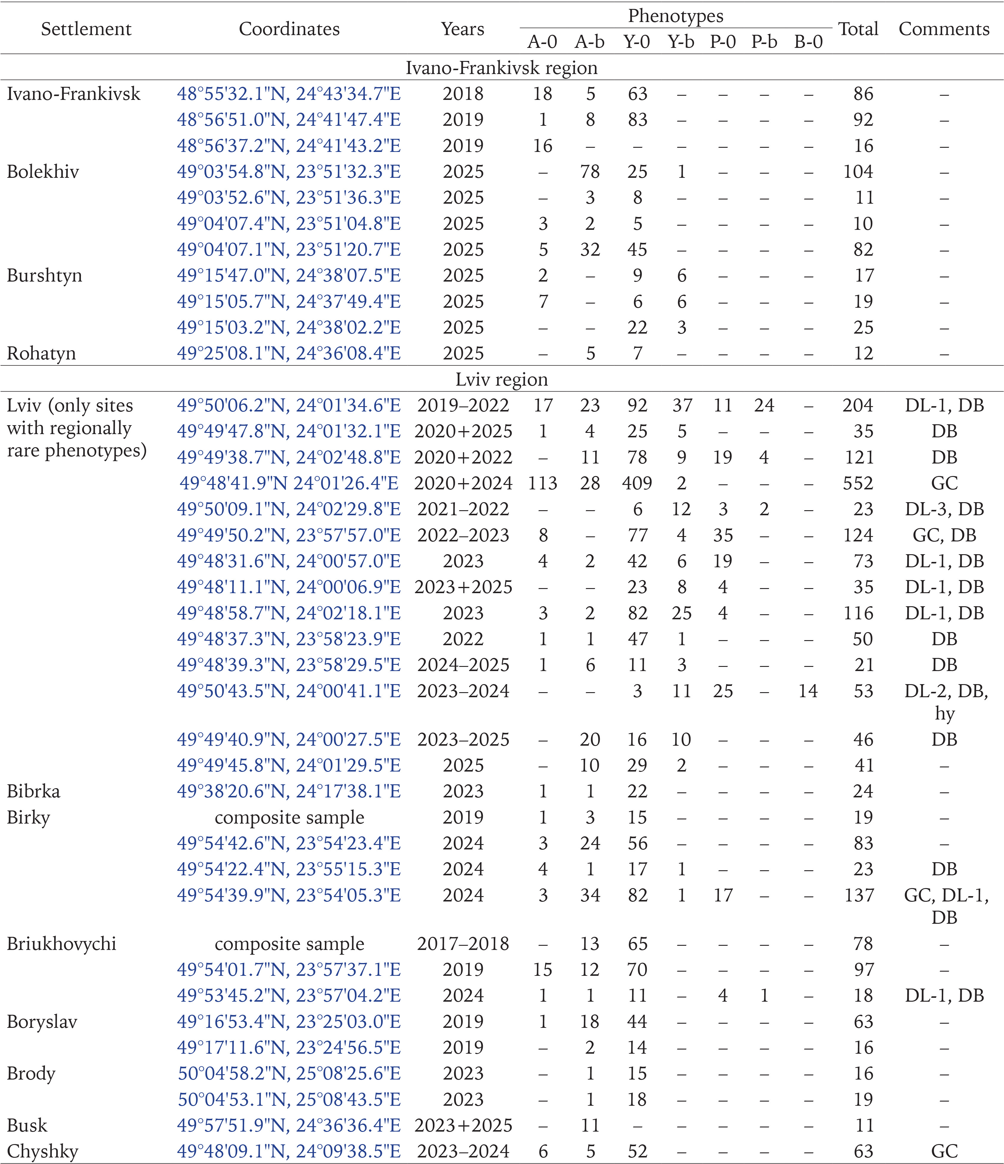 Appendix 2 shows the quantitative composition of phenotypes in the samples we studied: a total of 139 samples and more than 10 thousand specimens from 55 settlements or their immediate surroundings and 5 administrative regions in the western part of Ukraine. For Lviv, only a few samples are given, containing regionally rare colouration variants. The phenotypic composition of numerous Lviv populations of C. hortensis formed by the descendants of the primary introduction was analysed in detail in previous publications (Sverlova 2001b, Gural-Sverlova & Gural 2018, 2021a, 2022b, etc.). Appendix 2 does not include samples with less than 10 adults or their empty shells. The only exceptions are three smaller samples that showed signs of secondary introduction or a mixture of introductions.