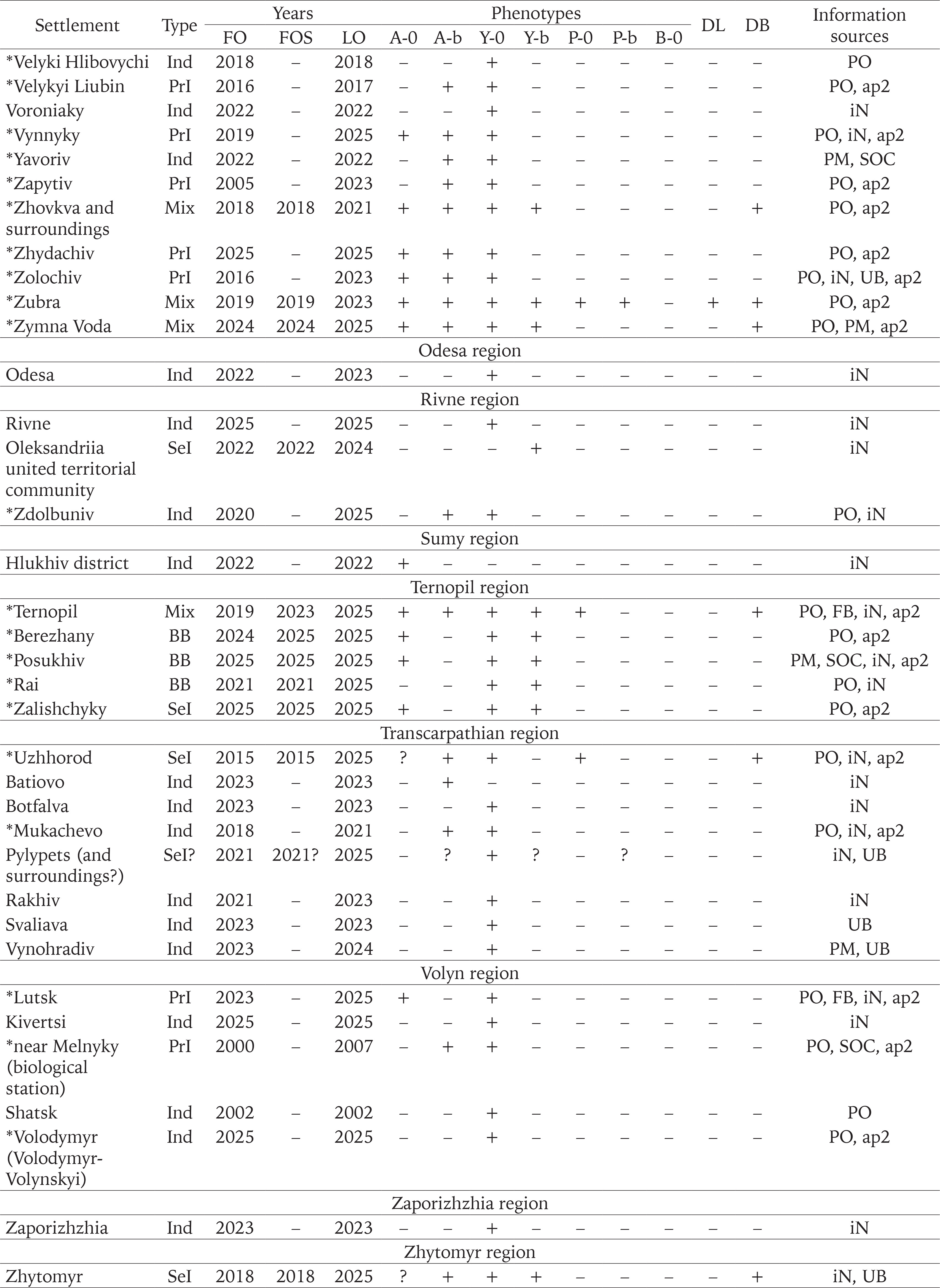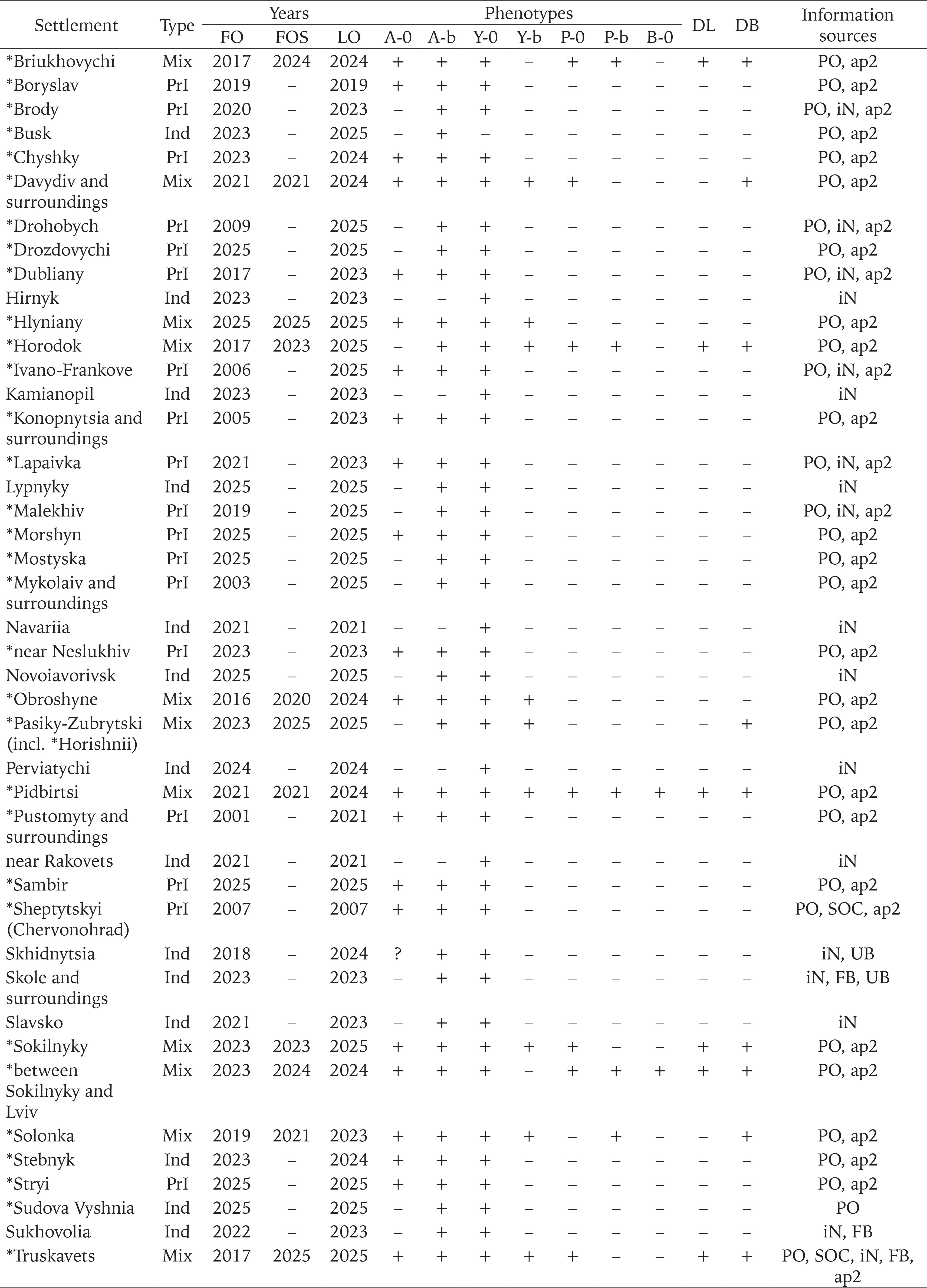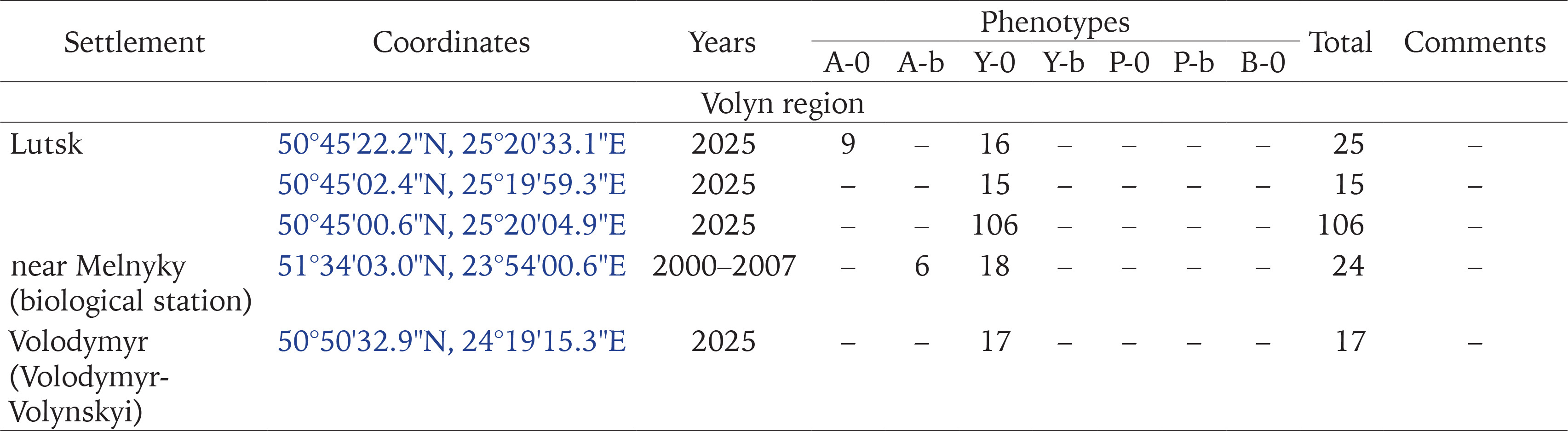 Appendix 2 shows the quantitative composition of phenotypes in the samples we studied: a total of 139 samples and more than 10 thousand specimens from 55 settlements or their immediate surroundings and 5 administrative regions in the western part of Ukraine. For Lviv, only a few samples are given, containing regionally rare colouration variants. The phenotypic composition of numerous Lviv populations of C. hortensis formed by the descendants of the primary introduction was analysed in detail in previous publications (Sverlova 2001b, Gural-Sverlova & Gural 2018, 2021a, 2022b, etc.). Appendix 2 does not include samples with less than 10 adults or their empty shells. The only exceptions are three smaller samples that showed signs of secondary introduction or a mixture of introductions.