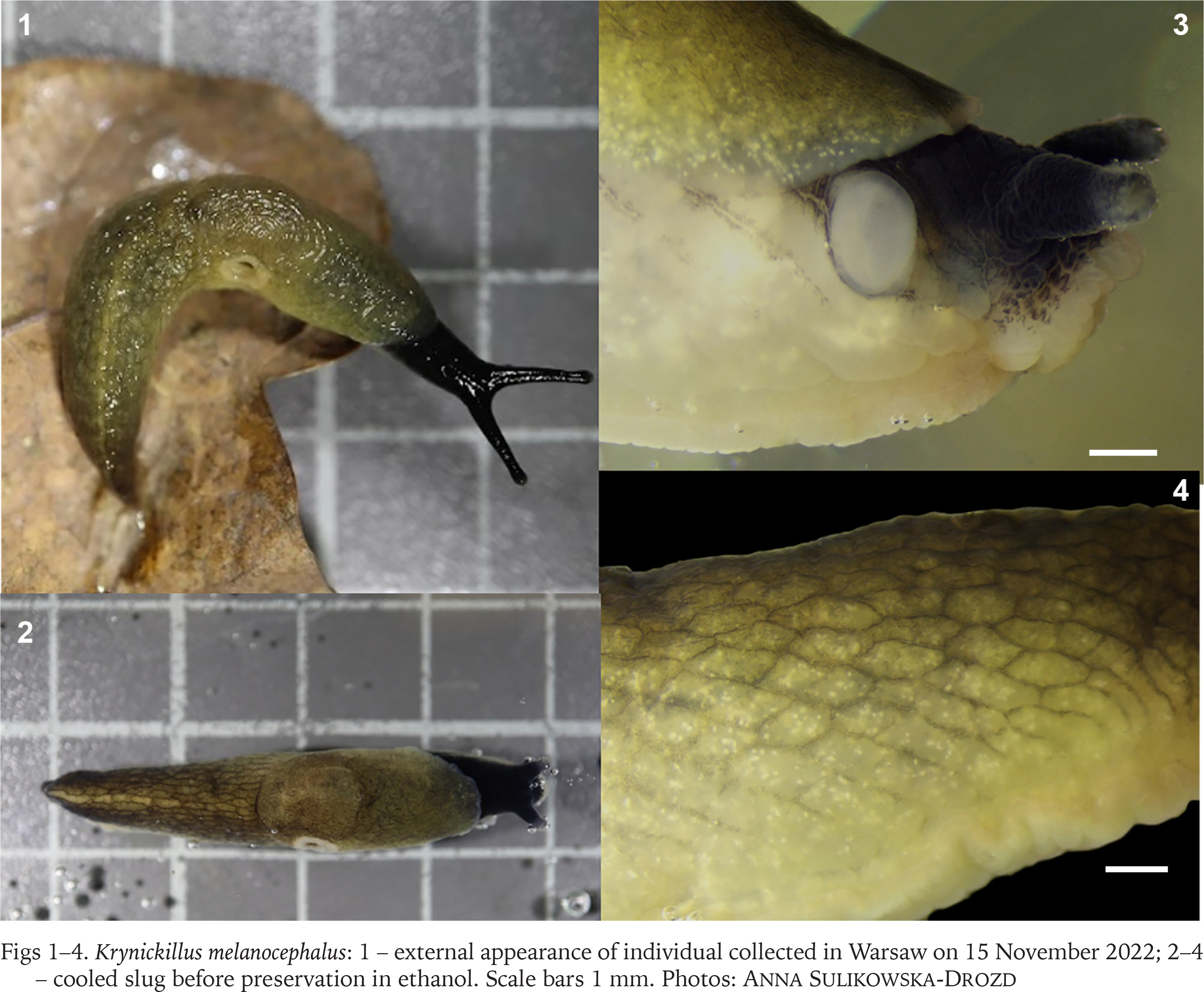 Krynickillus melanocephalus: 1 – external appearance of individual collected in Warsaw on 15 November 2022; 2–4 – cooled slug before preservation in ethanol. Scale bars 1 mm. Photos: Anna Sulikowska-Drozd