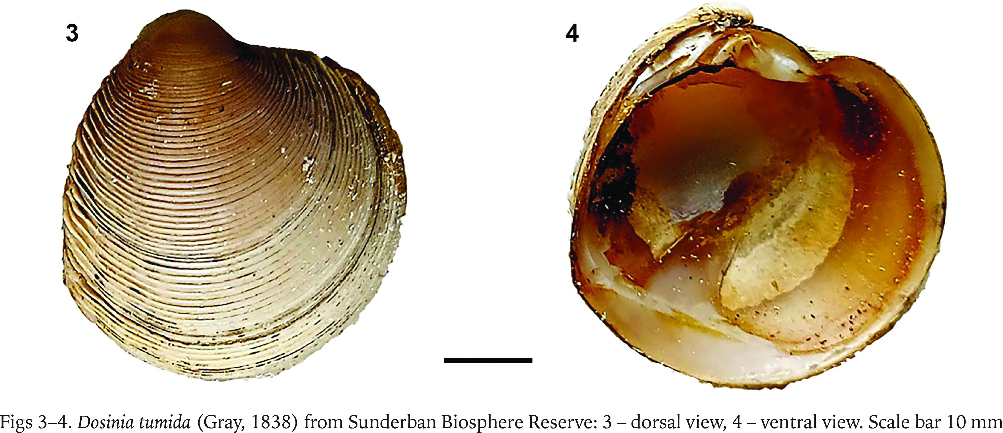 Dosinia tumida (Gray, 1838) from Sunderban Biosphere Reserve: 3 – dorsal view, 4 – ventral view. Scale bar 10 mm