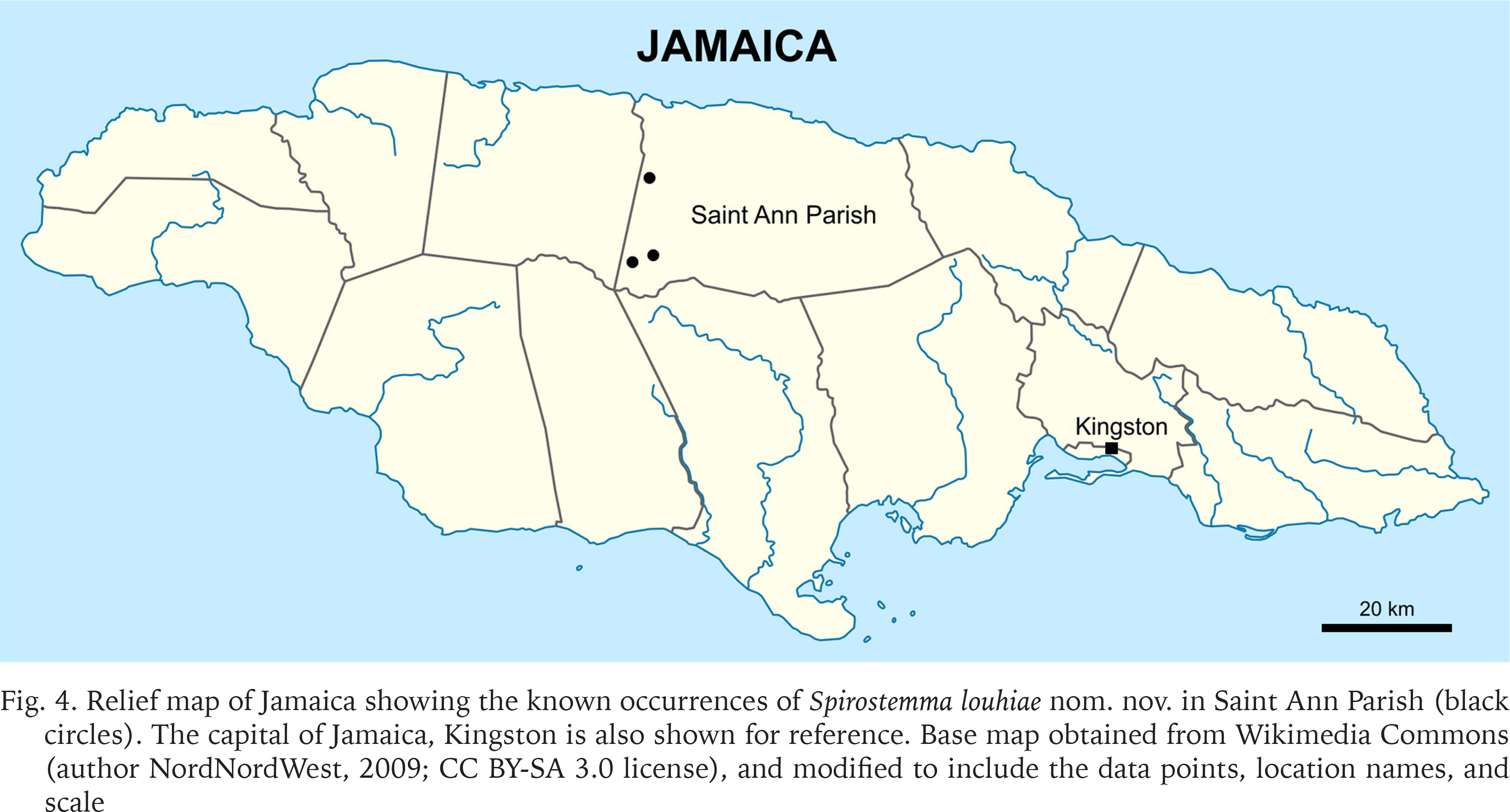Relief map of Jamaica showing the known occurrences of Spirostemma louhiae nom. nov. in Saint Ann Parish (black circles). The capital of Jamaica, Kingston is also shown for reference. Base map obtained from Wikimedia Commons (author NordNordWest, 2009; CC BY-SA 3.0 license), and modified to include the data points, location names, and scale