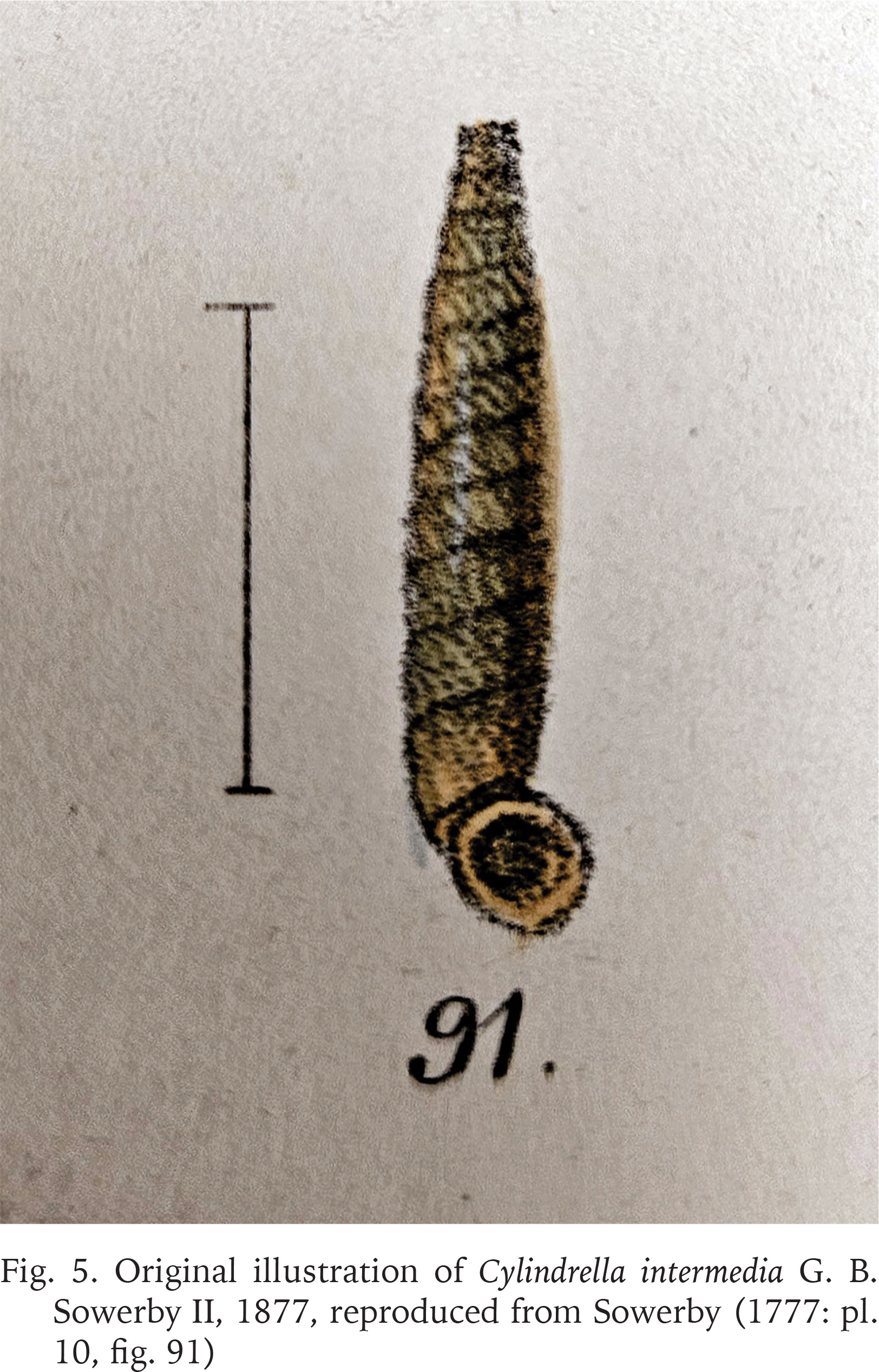 After our search for the original type specimens in the appropriate collections (NHMUK and NMW) failed, we decided to select a neotype for Cylindrella intermedia G. B. Sowerby II, 1877. The chosen specimen is the best-preserved specimen available (Fig. 1) and a close match to the original illustration by Sowerby (1877) (Fig. 5) in terms of size (the scale bar in the original suggests 12–13 mm), colour, and shape, including: number of whorls, height and proportion of whorls, the slight constriction on the body whorl, the basal keel of the body whorl (noticeable in the figure but not mentioned in the description, as already noted by Pilsbry 1903), and the aperture’s shape and position. Sowerby’s figure, however, shows a slightly taller body whorl (Fig. 5). The chosen neotype also has precise collection and locality data. The specimens from lot ANSP 460535 (Fig. 2) are an even closer match to Sowerby’s illustration, but these specimens became too damaged after being handled for photography and, thus, none was suitable for becoming a neotype.