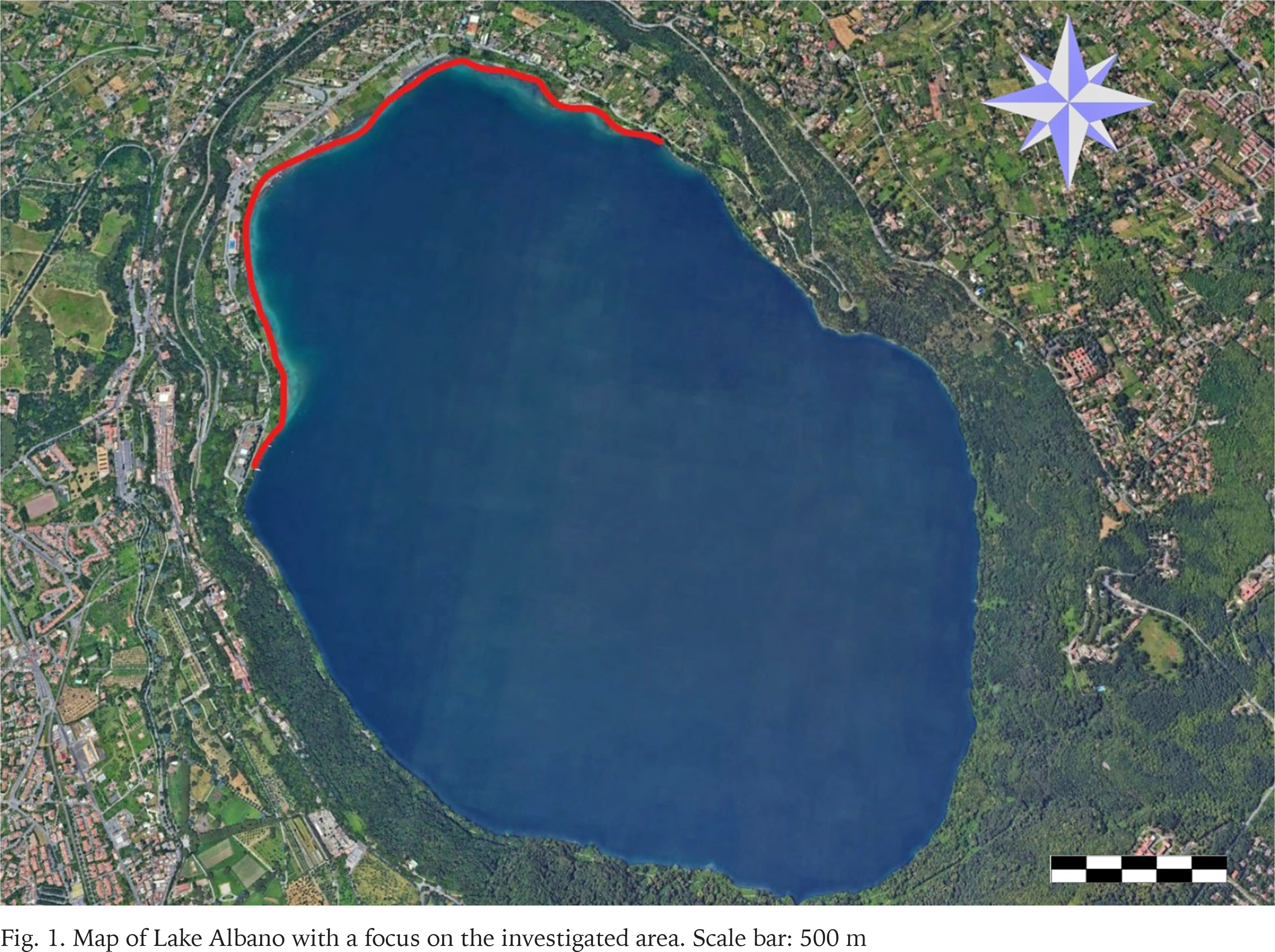 Lake Albano (Fig. 1), also known as Lake Castel Gandolfo or Lake Castello, is located in the Latium region of central Italy, at an elevation of 293 meters above sea level, approximately 24 km southeast of central Rome (Grano 2022). The lake occupies a deep volcanic crater within the Colli Albani range, which preserves the prominent geomorphological features of the so-called Vulcano Laziale. This volcano represents the southernmost and final phase of a chain of Quaternary volcanic complexes (Volsinii, Vico, and Sabatino) aligned along the Tyrrhenian margin of central Italy.