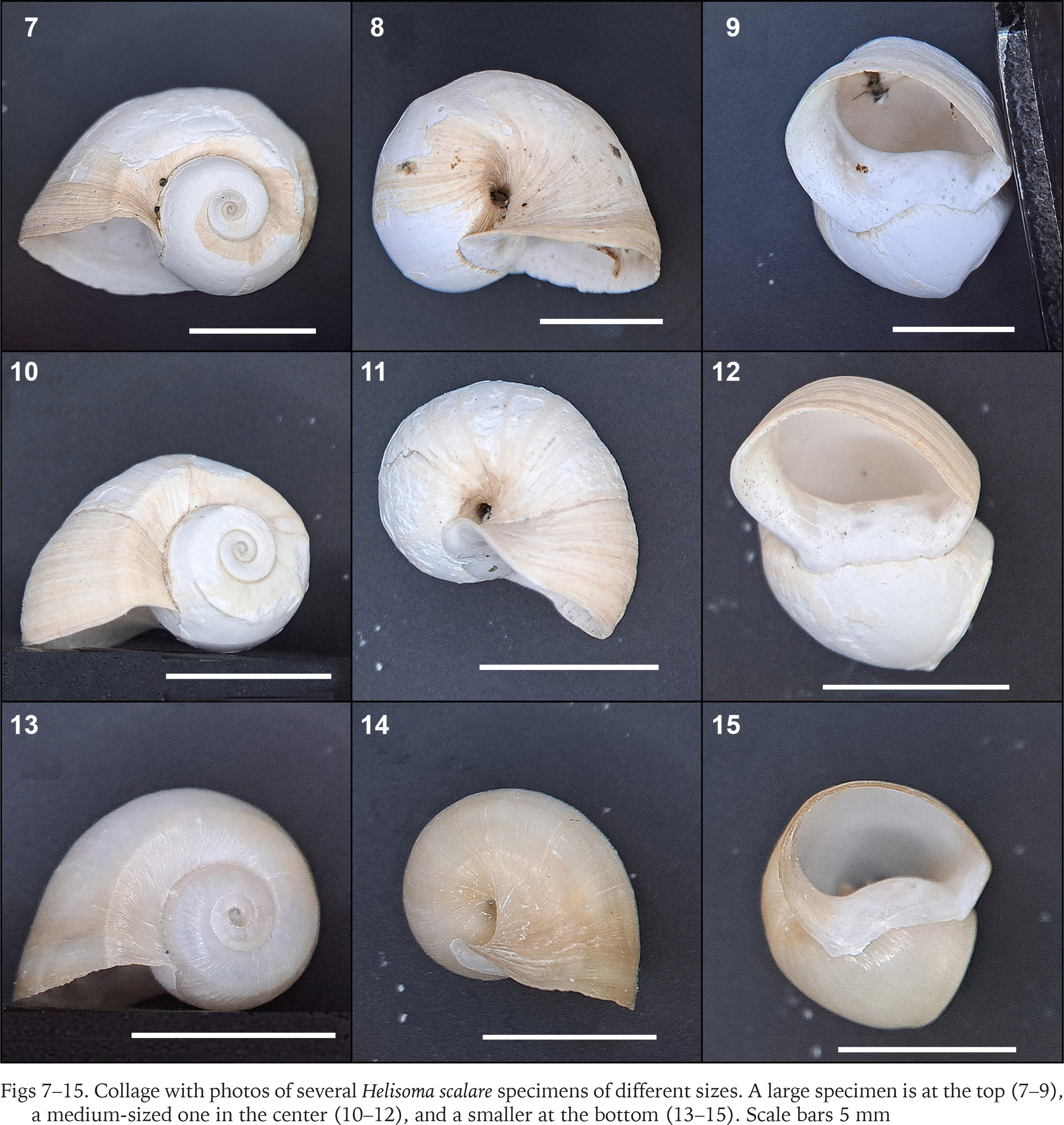 Collage with photos of several Helisoma scalare specimens of different sizes. A large specimen is at the top (7–9), a medium-sized one in the center (10–12), and a smaller at the bottom (13–15). Scale bars 5 mm