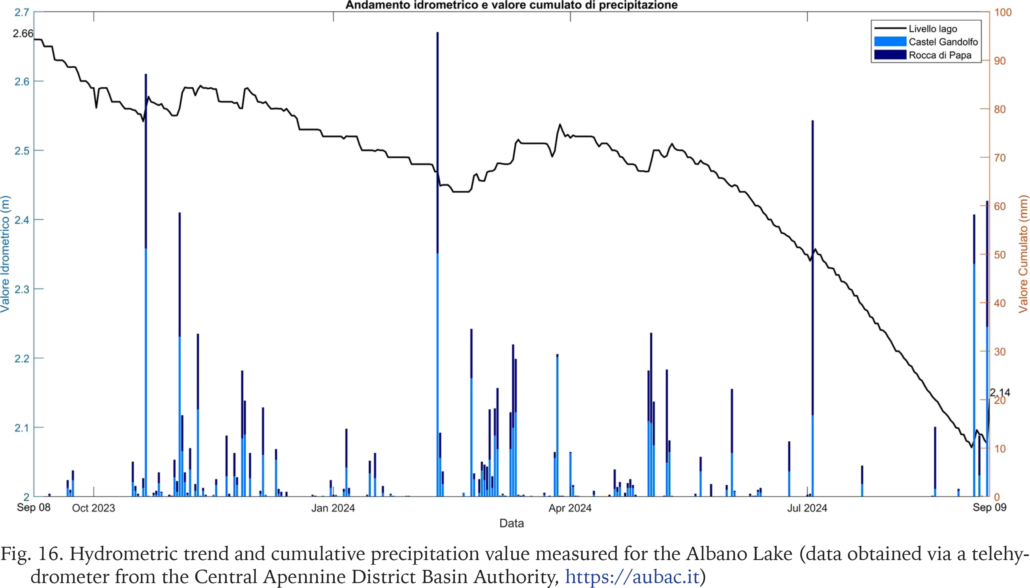 Hydrometric trend and cumulative precipitation value measured for the Albano Lake (data obtained via a telehydrometer from the Central Apennine District Basin Authority, https://aubac.it)