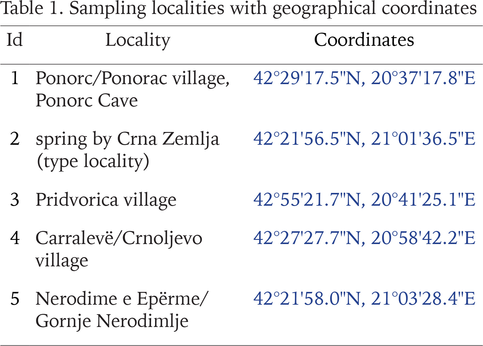 Radoman (1978) described a new genus of the truncatelloid snail Terranigra Radoman, 1978, with its type species Terranigra kosovica Radoman, 1978. The genus still remains monotypic (Radoman 1983, 1985, Kabat & Hershler 1993). The genus was characterised by a big bursa copulatrix with a short duct, two seminal receptacles, with the distal (rs1) seminal receptacle very small, nearly vestigial, and the proximal (rs2) seminal receptacle big, and the penis simple without outgrowths. The type locality of T. kosovica is a spring by Crna Zemlja (which means black soil, in Latin terranigra), near Mala Reka, about 6 km west of Nerodimlje (=Nerodime e Epërme) and 12–13 km west of Uroševac (=Ferizaj) town (Table 1, Fig. 1, locality 2). The species was reported by Radoman (1983) from three other additional localities (Table 1, Fig. 1): a small spring at the village of Pridvorica, near the place Velji Breg on the road Ribarić-Kosovska Mitrovica (locality 3); the spring below the rock in Crnoljevo village (=Carralevë), Gornja Mahala, a little over the road Štimlje-Prizren (locality 4); the spring (fountain) at the forester’s hut, near the confluence of the Mala and Velika Reka, at the beginning of Nerodimka River (locality 5) (Radoman 1978). This species, with an unpigmented body and with eyespots present, was reported as a “subterranean form” inhabiting also epigean springs (Radoman 1978, 1983). To our knowledge, there are no more published data on Terranigra, except imprecise information about 10 sites in The IUCN Red List of Threatened Species (Seddon 2011).