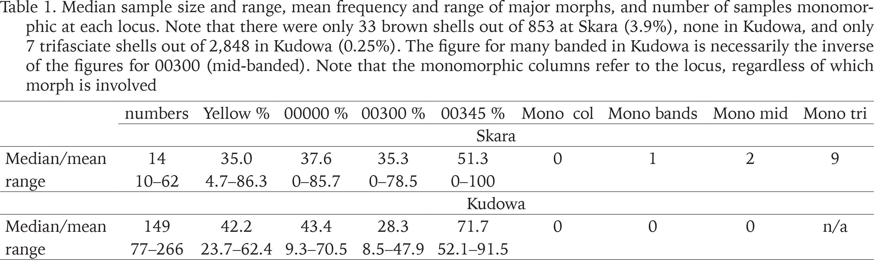 Median sample size and range, mean frequency and range of major morphs, and number of samples monomorphic at each locus. Note that there were only 33 brown shells out of 853 at Skara (3.9%), none in Kudowa, and only 7 trifasciate shells out of 2,848 in Kudowa (0.25%). The figure for many banded in Kudowa is necessarily the inverse of the figures for 00300 (mid-banded). Note that the monomorphic columns refer to the locus, regardless of which morph is involved