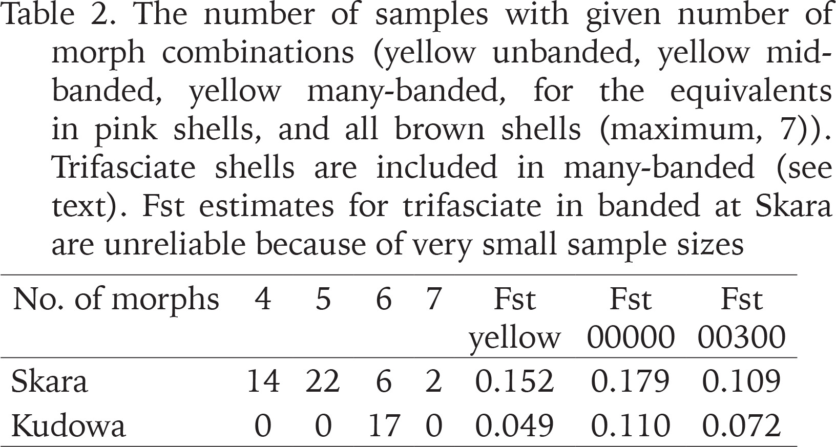 There are 46 samples from Skara, and 17 from Kudowa containing at least 10 shells. Their co-ordinates and composition are given in the Appendix. Table 1 shows median and range of sample size, the means and ranges of each morph frequency and the number of samples monomorphic at that locus. Table 2 shows the distribution of numbers of morphs among samples, and the value of the modified and corrected Fst for each colour and banding category.