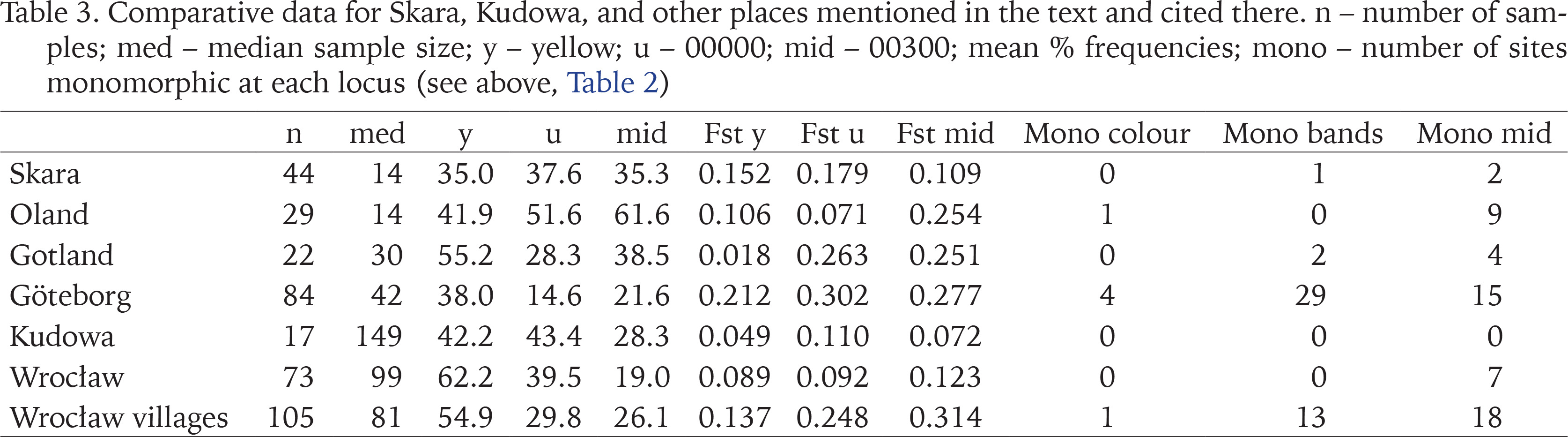Comparative data for Skara, Kudowa, and other places mentioned in the text and cited there. n – number of samples; med – median sample size; y – yellow; u – 00000; mid – 00300; mean % frequencies; mono – number of sites monomorphic at each locus (see above, Table 2)