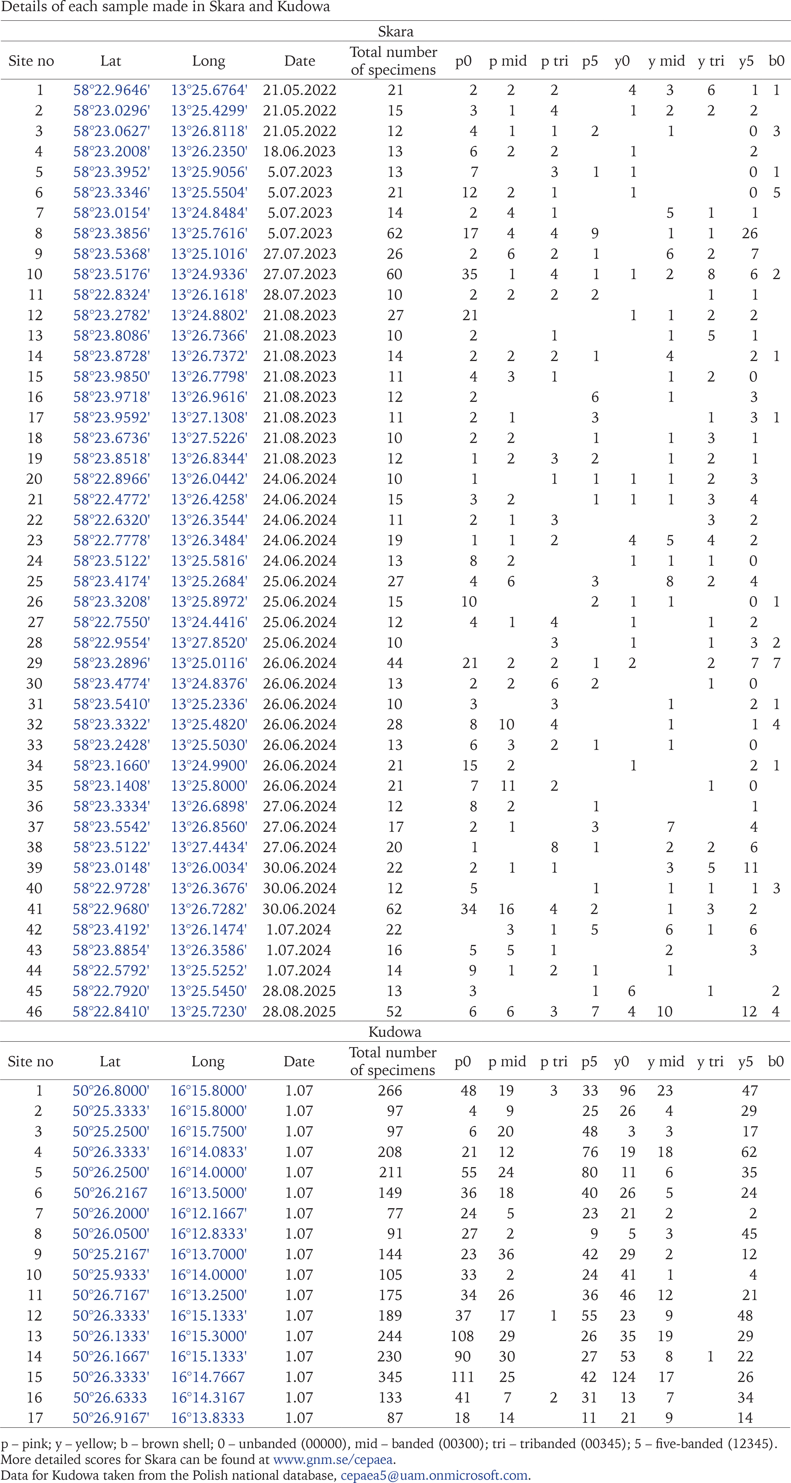 Samples in Skara were all made by TvP between 2022 and 2025. Samples in Kudowa were made by RADC and the late Beata M. Pokryszko in 2007; they were entered in the Polish national database (cepaea5@uam.onmicrosoft.com) and later used in a national analysis (Ożgo et al. 2019), but are not separately published. Each sample in both towns comes from less than 30 m of typical anthropogenic habitats: roadside verges, hedges, garden or park boundaries, residential or commercial developments in progress. These vary in cover over very short distances, and no attempt has been made to classify them by shade or vegetation. The greatest distance between samples was 3.2 km in Skara, and 4.6 km in Kudowa.